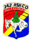 The Unit Crest for the 242nd Assault Support Helicopter company depicts a mule with two rotor heads strapped to its back, and the word "Muleskinner" inscribed above it.