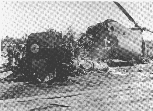 Now to take inventory. Everyone got out. Thank God! One grunt had scratched his face and the flight engineer had sprained his wrist. He also was soaked in hydraulic fluid and was very lucky not to have caught on fire since he was standing under the aft pylon when it separated and caught on fire. In fact, it all happened so fast that his intercom cord was burned in two before he could say anything on the intercom. What a relief and what a fire! The aft rotor and aft pylon had separated from the fuselage with the result of exposing gallons of oil and jet fuel to the hot turbine engine exhaust causing the instant fire. One aft rotor blade was thrown 110 yards. Fortunately, the pad flew into the left side of the aft rotor which pulled the hub and transmission away from the front rotor and fuselage instead of into them, which a blade strike on the right would have caused.